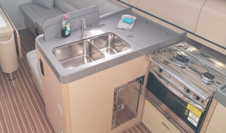 Zu erwähnen ist weiterhin die Pantry, denn die ist ordentlich groß und gut ausgestattet. Ofenkocher, zwei Spülen und vor allem der sowohl von oben als auch von der Seite aus zugängliche, etwa 130 Liter fassende Kühlschrank können begeistern. Um mehr Arbeitsfläche zu erhalten, sind die Waschbecken und der Kocher mit Einlegebrettern abdeckbar, eine simple gute Lösung.