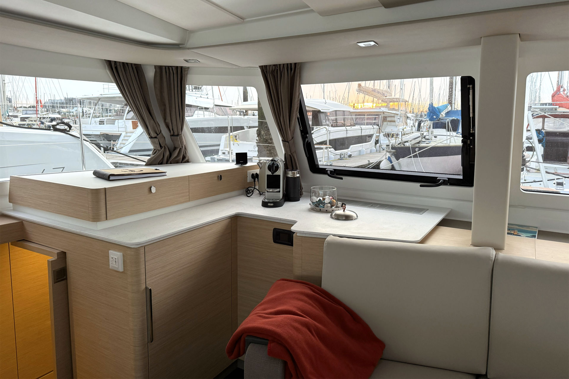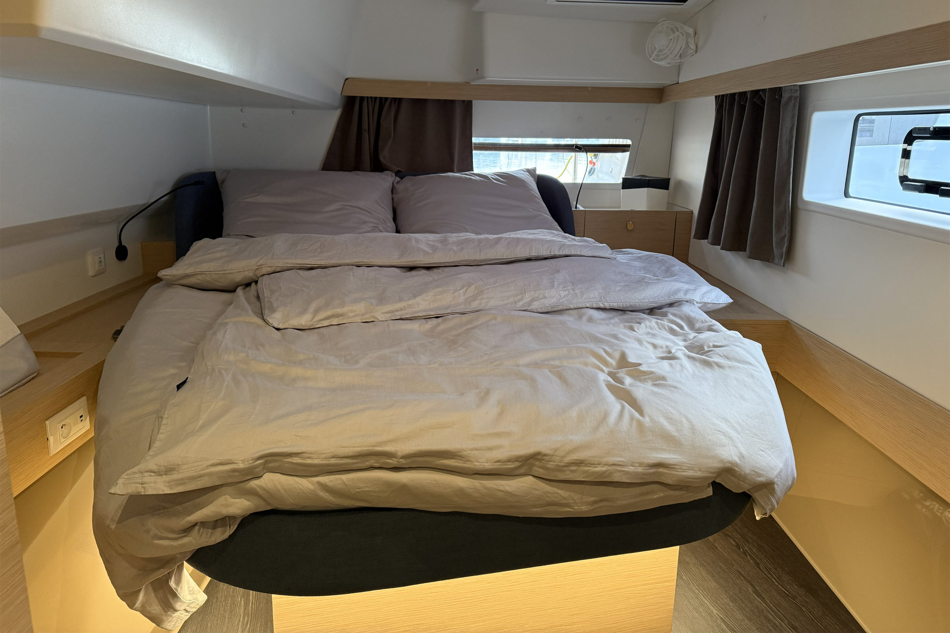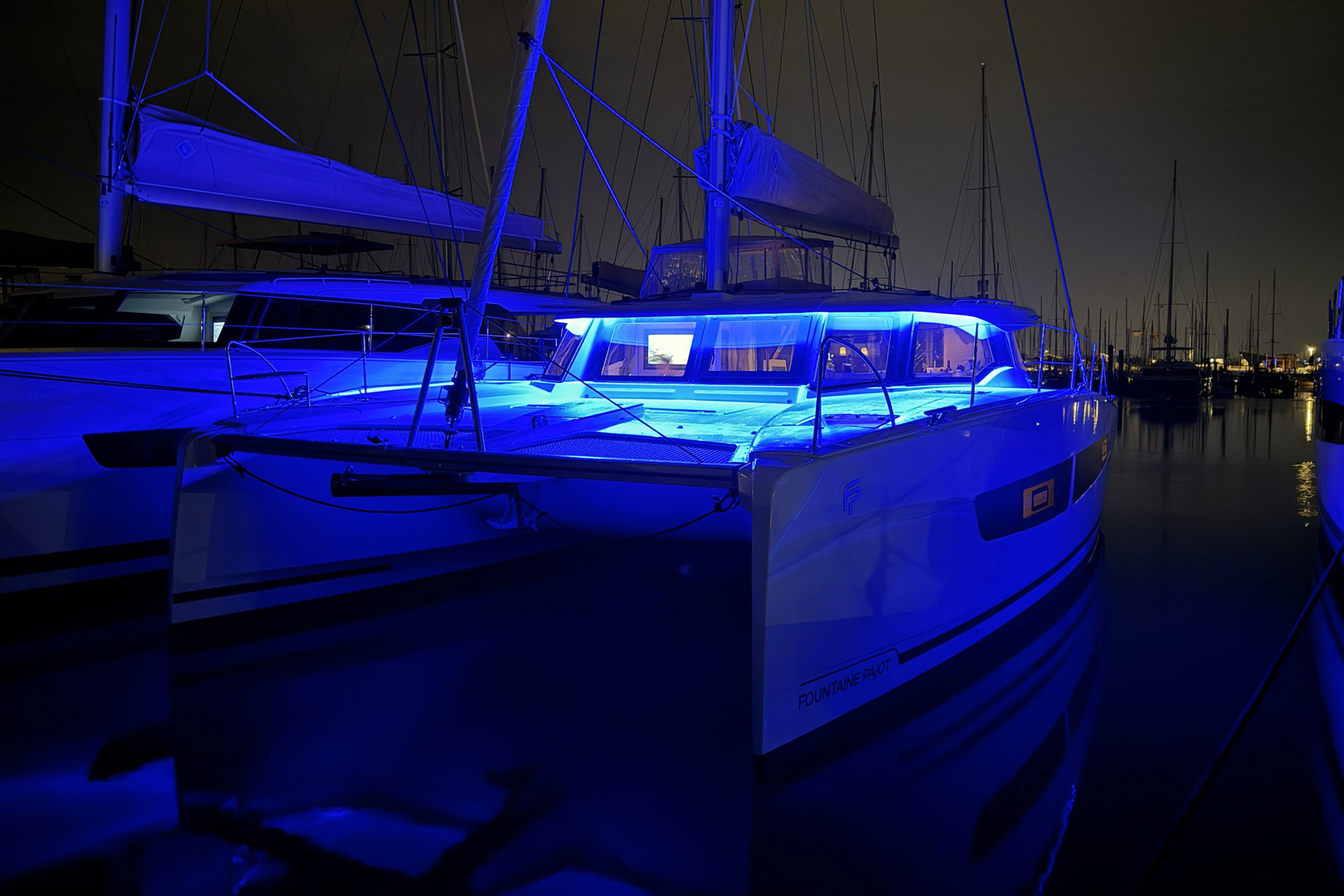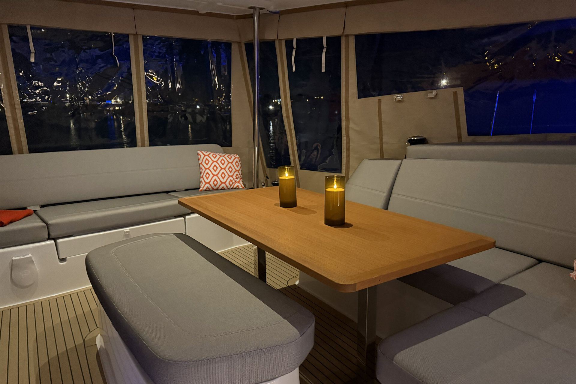 Im Inneren setzt die FP 41 NEW „Gin Mar“ auf helle, freundliche Materialien und großzügige Raumaufteilung. Eine große Schiebetür verbindet den Salon mit dem Cockpit, wodurch ein offener Lebensraum entsteht. Besonders praktisch ist die Kücheninsel mit Gas-Backofen (45 l), zusätzlichem Cockpit-Kühlschrank und viel Stauraum. Der Salontisch lässt sich zu einem weiteren Bett umbauen, alle Kabinen und der Salon verfügen über Vorhänge. Für maximalen Komfort sind Lattenroste unter den Matratzen, eine Klimaanlage (44–48.000 BTU) sowie eine Waschmaschine (3 kg) an Bord. Unterhaltung bietet das Bose Bluetooth-System mit vier Lautsprechern, während die Unterwasserbeleuchtung für besondere Erlebnisse sorgt. Zwei 300-Liter-Wassertanks sichern die Versorgung auf längeren Törns.