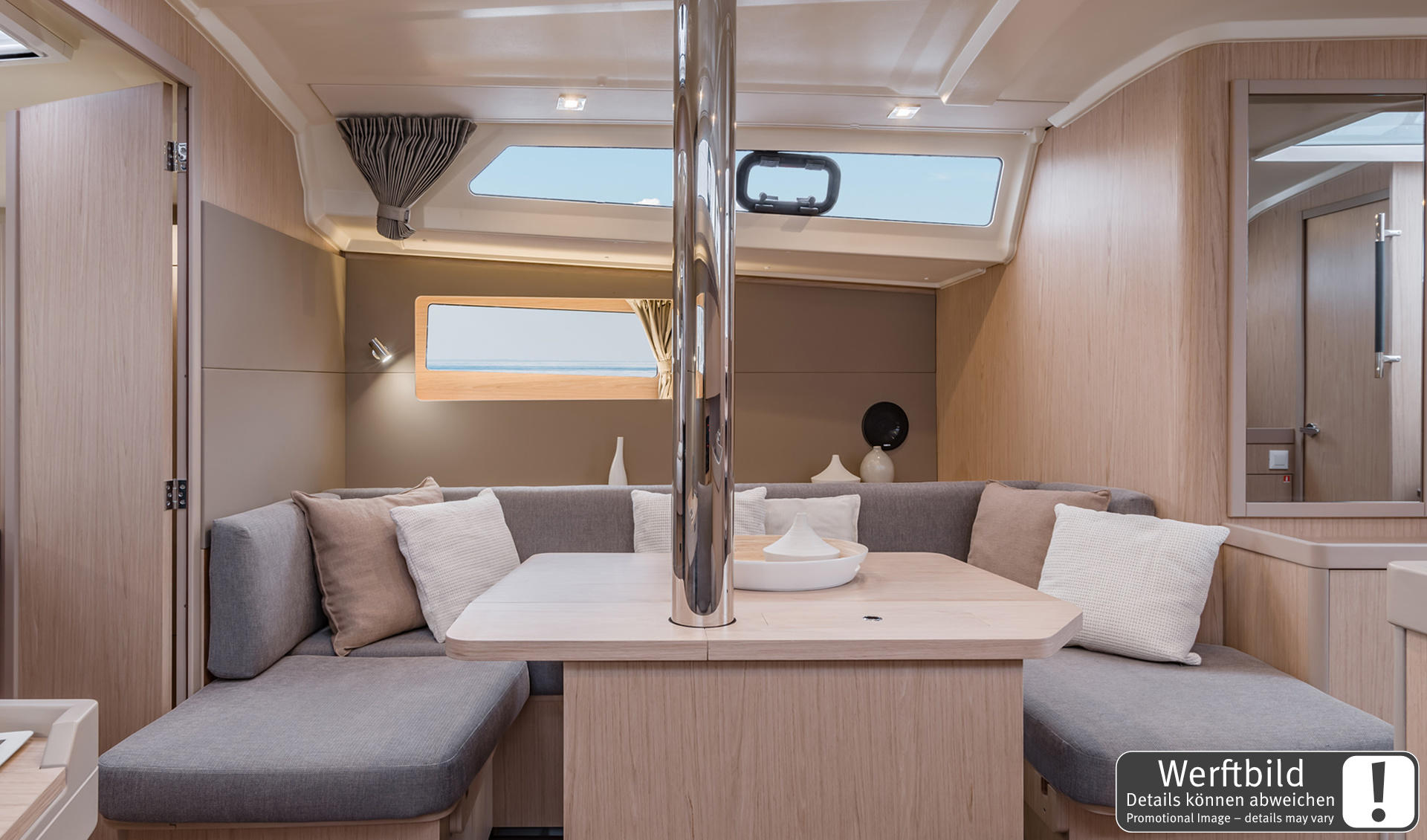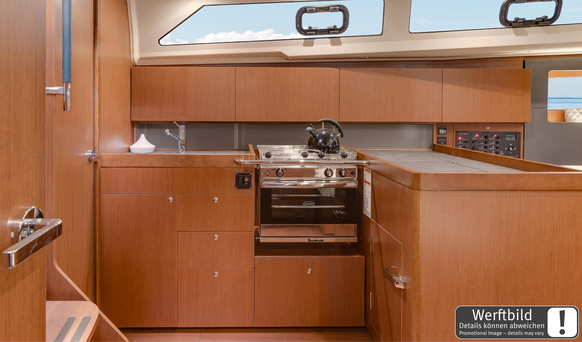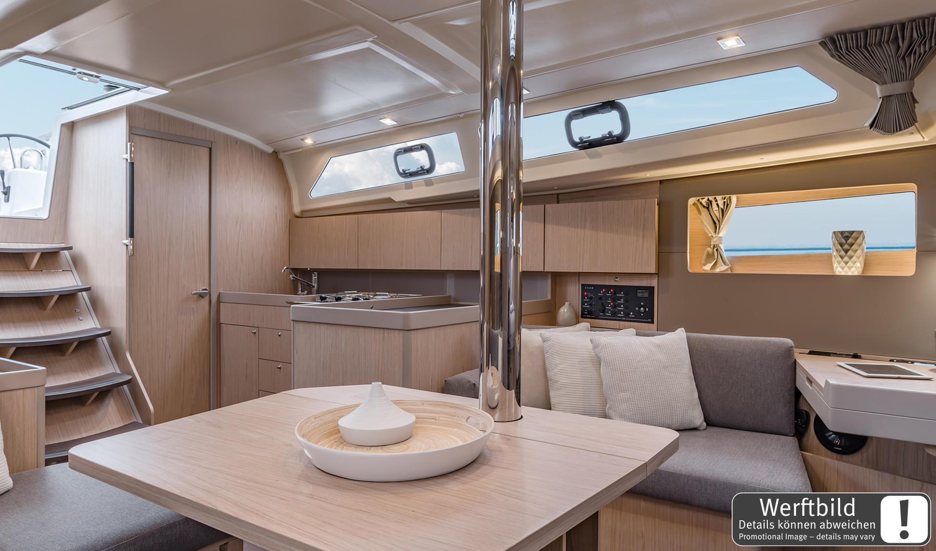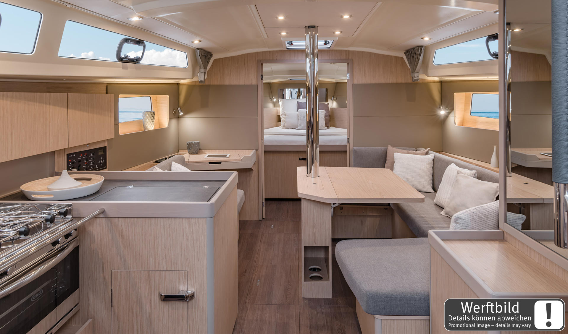 Auffälliger die Erneuerungen im Innenraum. Mit einer breiten Tür zum Vorschiff und großen Rumpffenstern ergibt sich ein Plus an Raumgefühl gegenüber dem alten Boot. Moderne, helle Oberflächen und viele rechte Winkel, besonders in der Pantry, erinnern mehr an ein Wohnmobil als an ein Segelboot. Wobei dunkleres Alpi-Mahagoni ebenfalls zur Wahl steht. Mit Kunstleder bespannte Paneele veredeln das Hauptschott und die Salonseiten. Dort stehen sie senkrecht, was die Rundungen der Rumpfschale unsichtbar macht und wieder etwas Raum kostet.