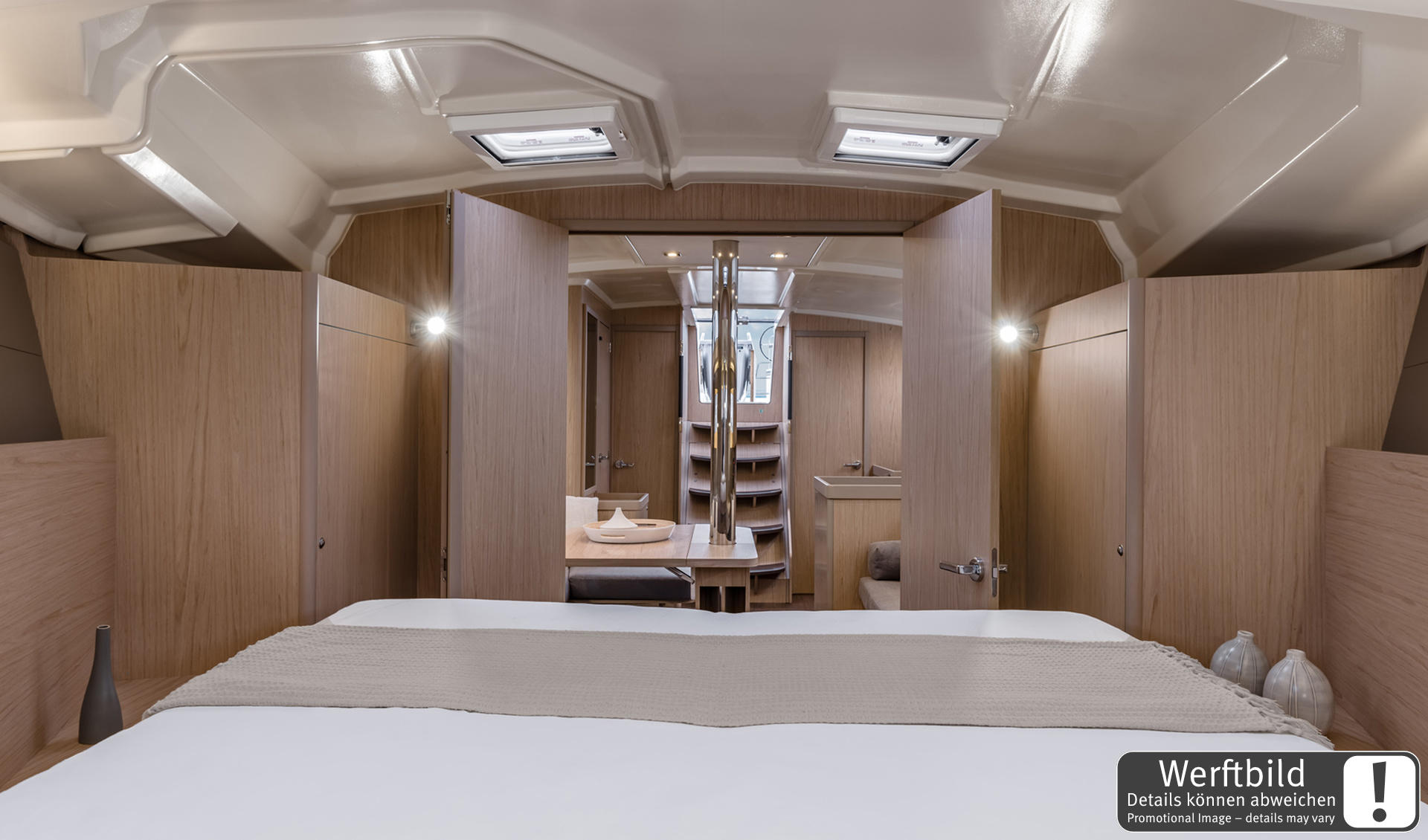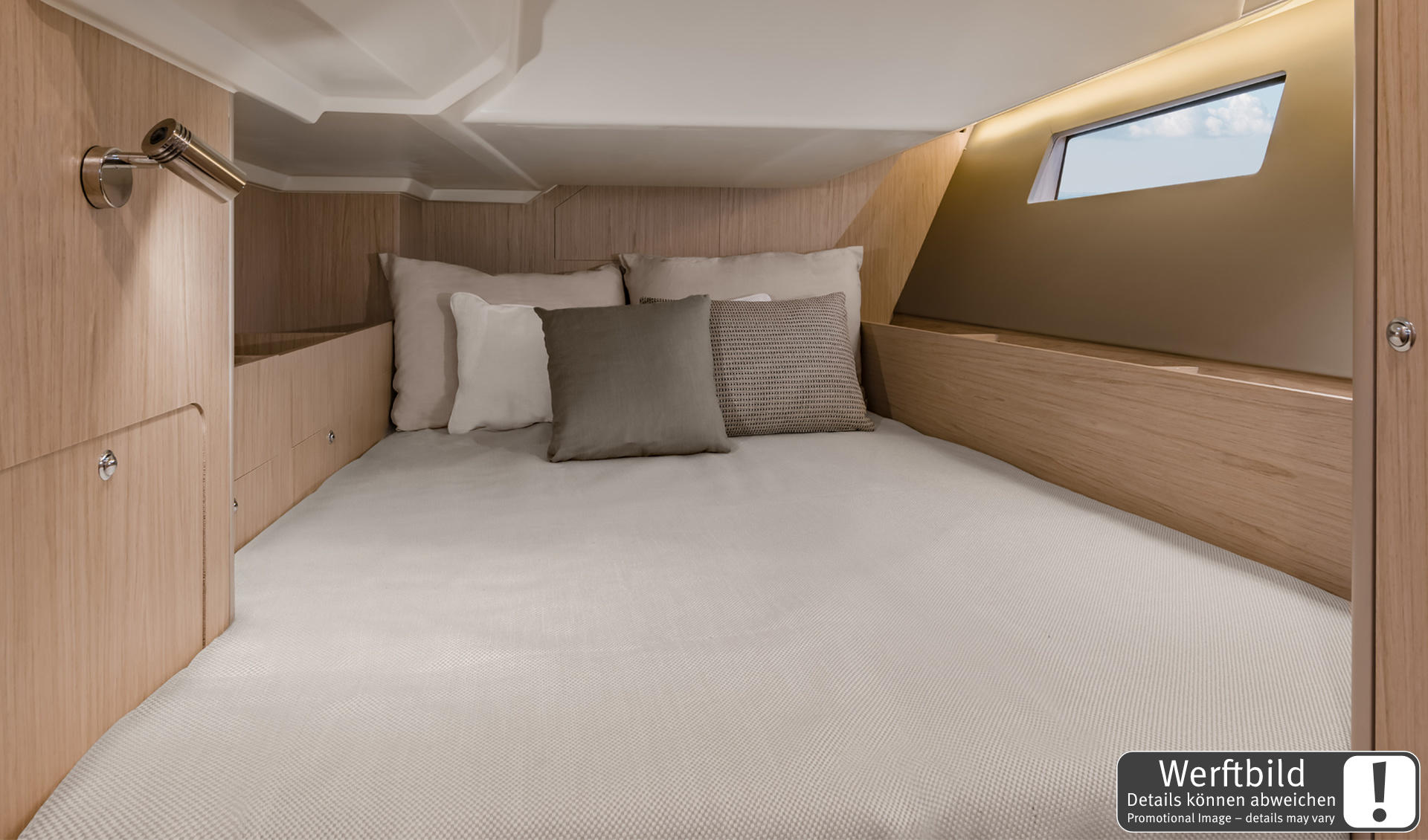 Weitere, wenn auch nicht neue Besonderheit: Der angenehm begehbare Niedergang ist etwa zehn Zentimeter nach Backbord versetzt. Konstrukteur Pascal Conq: „So fluchtet er besser mit dem Durchgang im Salon nach vorn, und wir haben mehr Platz für die Tür der Steuerbordkabine geschaffen, die sonst durch das davor liegende Bad zu klein ausgefallen wäre.“ Die Maßnahme zieht wiederum eine kleinere Backbordkammer mit knapper Koje nach sich, wenn der Kunde denn die Drei-Kabinen-Version wählt. Mit nur einer Achterkabine ist an Backbord ein begehbarer Schrank vorgesehen, und die Backskiste dahinter fällt größer aus. Weitere Wahlmöglichkeit: eine zweite Nasszelle. Die wird im Vorschiff eingebaut und bedingt dann weniger Raum sowie eine schräg stehende Koje.