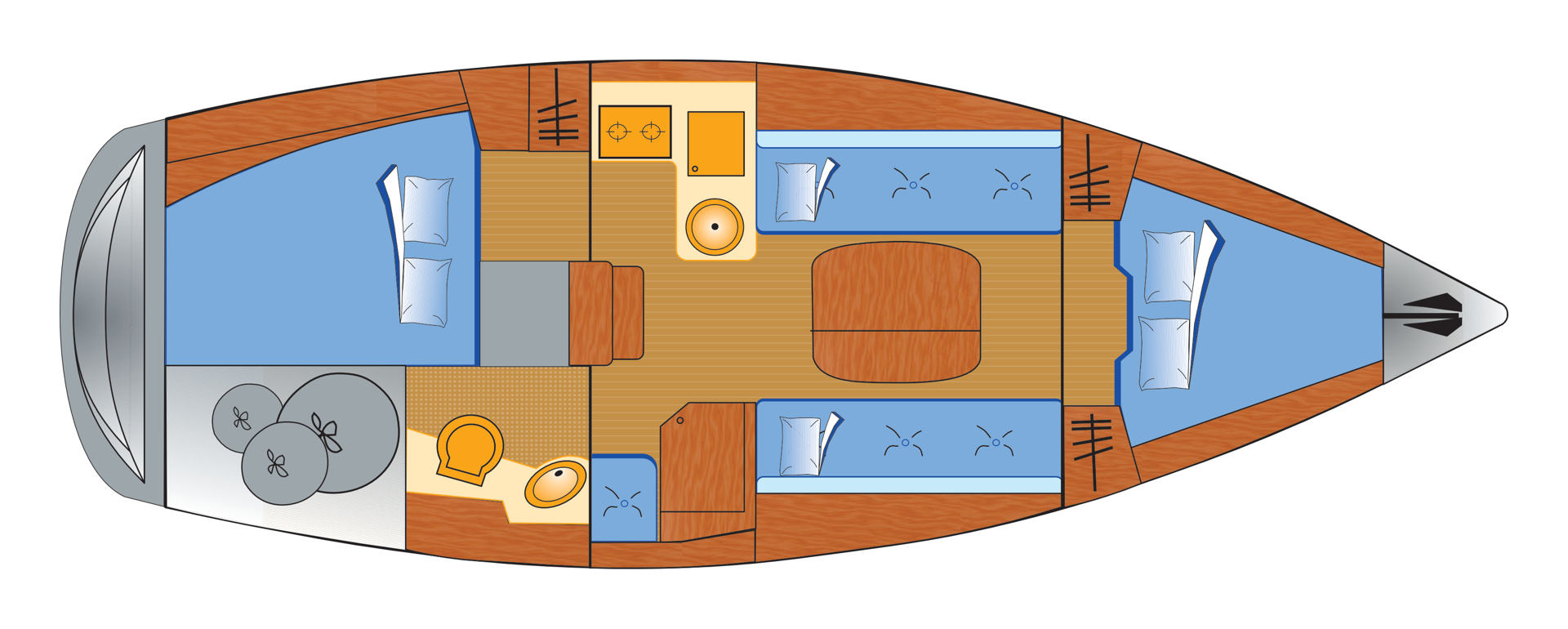 Wie schon an Deck, wartet die Bavaria 31 cruiser, im Vergleich zu der älteren Schwester, auch unten mit wenigen Überraschungen auf. Die Einrichtung spiegelt sich ab dem Niedergang fast symmetrisch um die Längsachse. Mit dieser konventionellen Aufteilung wurde der zur Verfügung stehende Raum bestmöglich genutzt. Im Vorschiff wurden zwei geräumige Schränke eingebaut. Auf den Salonkojen finden die bis zu sechs Crewmitglieder um den großen Tisch herum ausreichend Platz.