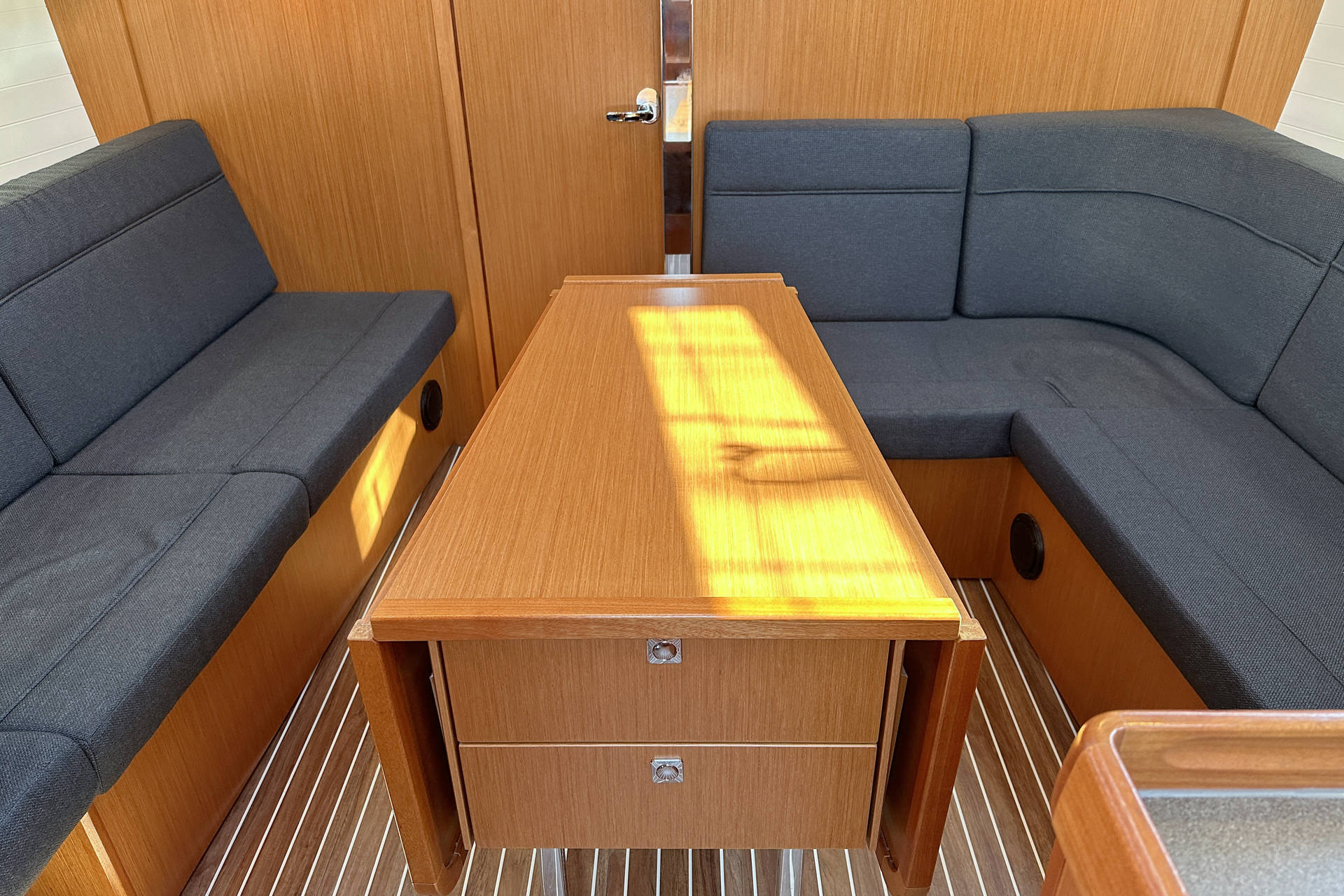 Das offenbart sich beim YACHT-Test besonders im Vergleich zu einer ebenfalls am Steg des Laboer Händlers AP Yachting liegenden 36er. Die wirkt behäbiger, dicker, älter. Dazu tragen auch die deutlich längeren Sülls des älteren Bootes bei. Weitere Auffälligkeiten sind eine kombinierte Fuß- und Scheuerleiste aus Aluminium, ein gelungener Tritt auf dem Ankergalgen und ein dunkelgelber Decksbelag in Teakanmutung (Duradeck). Geblieben ist die Werft bei der stattlichen Heckklappe, die den Zugang im Hafen erleichtern kann und zusätzliche Decksfläche bietet. Sie wird per Hand, unterstützt von kräftigen Gasdruckfedern, einfach gehoben und gesenkt. Im geschlossenen Zustand ergibt der obere Abschluss eine schmale Rudergängerbank für Segler, die direkt hinter einem der Räder sitzen wollen.
