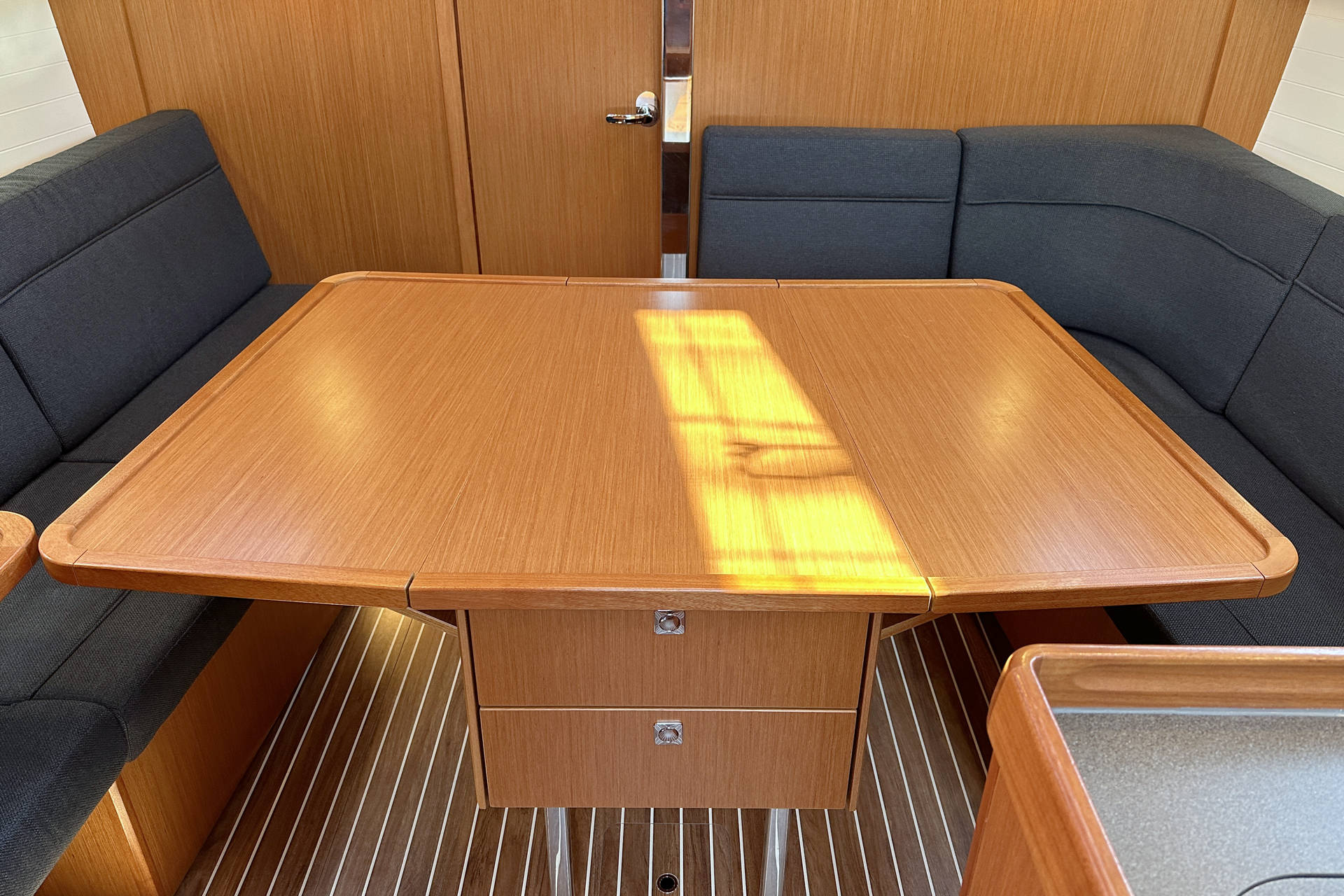 Signifikante Neuerungen betreffen das Deck: Der Aufbau hat statt der kleinen rechteckigen Schießscharten nun größere durchgehende, langgezogene Fensterscheiben erhalten, dazu statt vier ganze fünf Deckenluks. Ebenso prägnant: Es gibt jetzt eine Doppelsteueranlage. Deren Installation machte ein neues Cockpit mit nach vorn versetztem Niedergangsschott wünschenswert, weil die Plicht kleiner geworden wäre. Dies wiederum bedingte ein nach vorn versetztes Hauptschott, weil wiederum der Salon gelitten hätte.