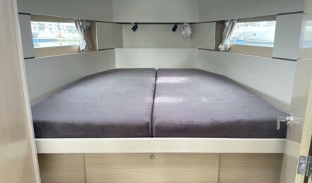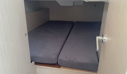 Die andere Option hinten teilt den gleichen Raum in zwei gleiche Kabinen mit nach vorne und hinten ausgerichteten Viertelstockbetten. Der Sitz im Cockpit wird viel flacher, um die Kopffreiheit in der Steuerbordkabine zu erhöhen.