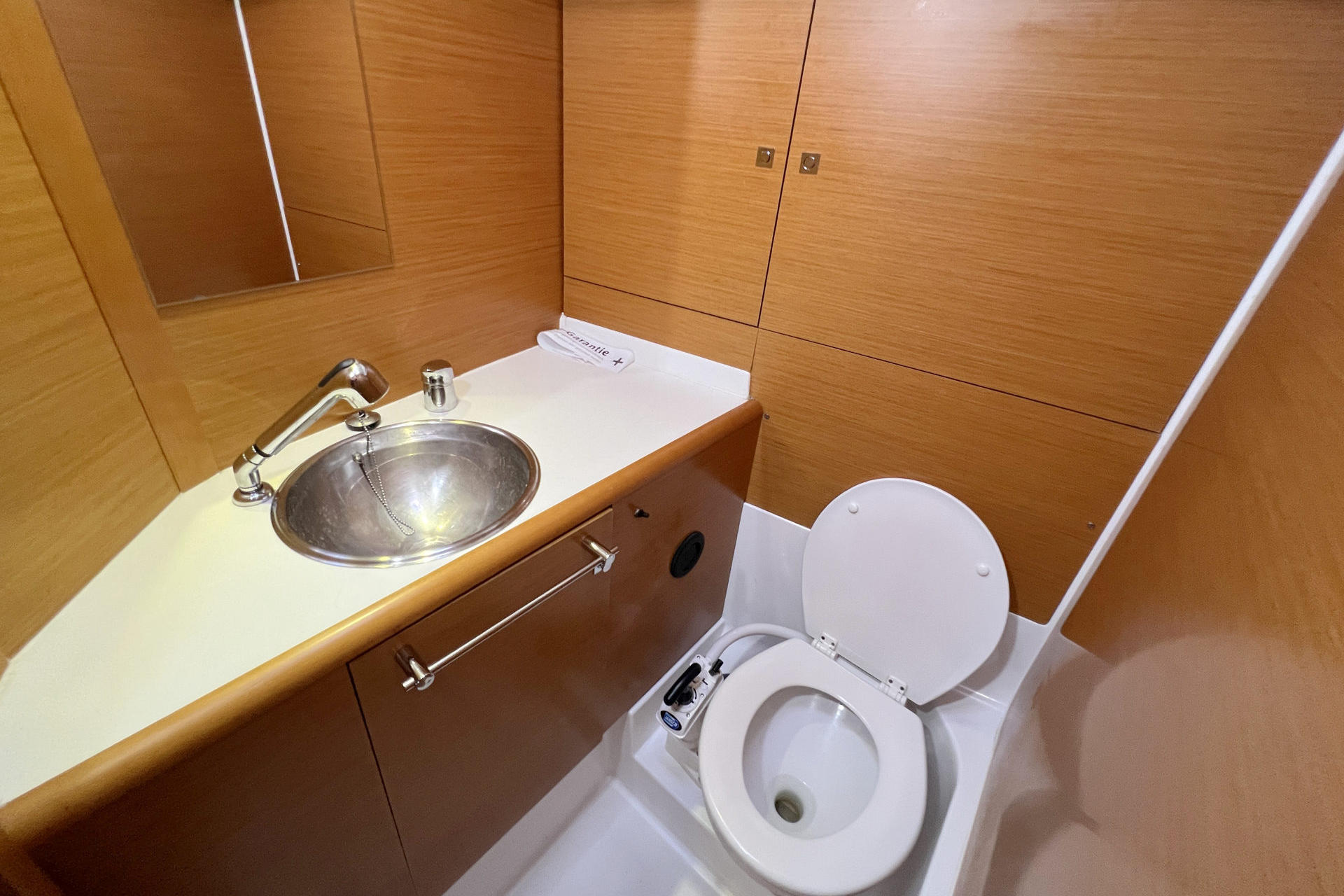 Damit reagiert die Werft auf entsprechende Nachfragen von Kunden und Charterunternehmen. Eine zweite Nasszelle gilt für Tourenboote mit 40 Fuß Länge heute als Maß der Dinge. Trotz Bad im Vorschiff bleibt es in der Eignerkammer im Bug angenehm geräumig.