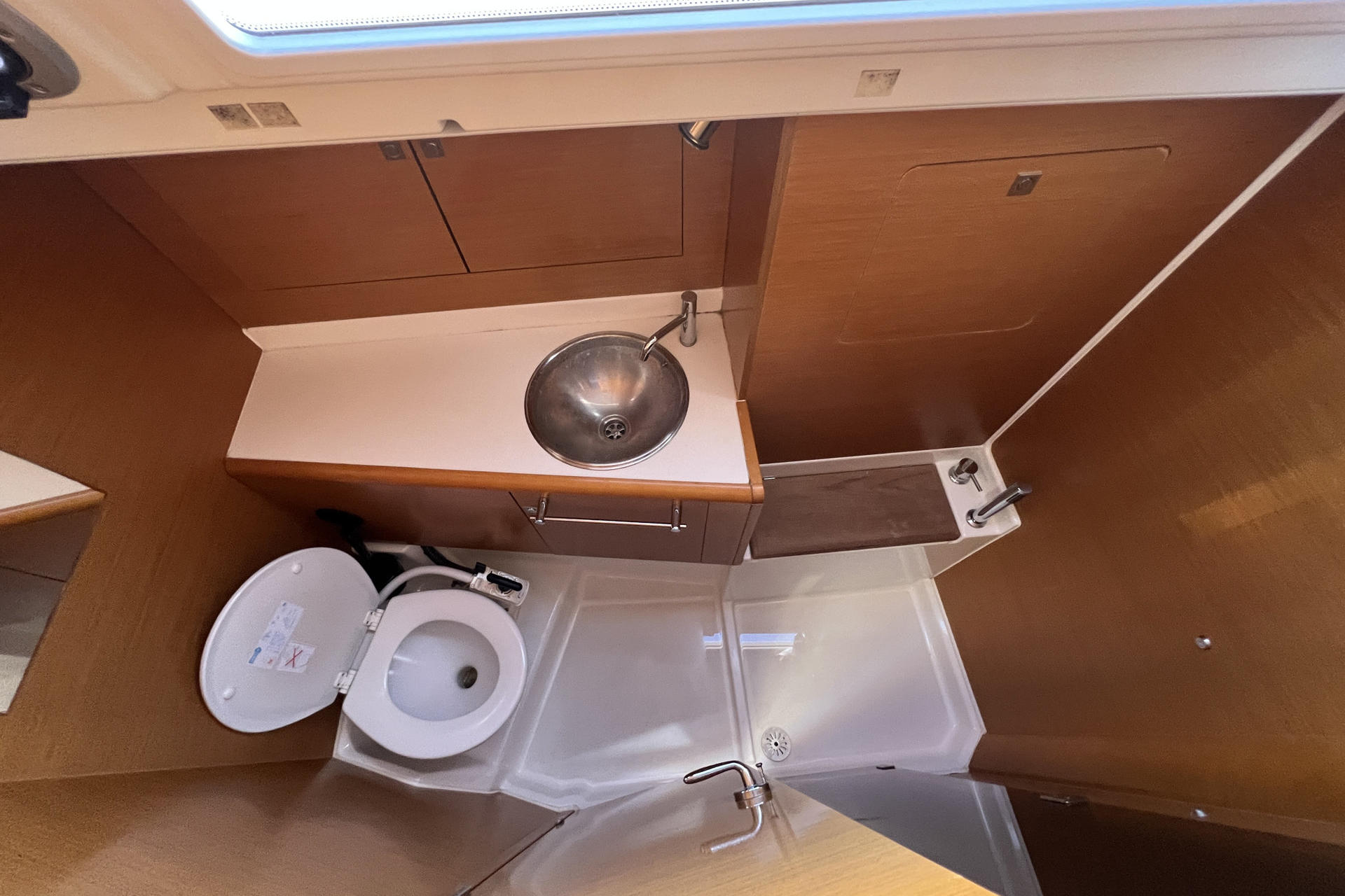 Unter Deck überzeugt die Sun Odyssey 409 mit einem großzügigen Wohnbereich. Die optimierte Vorschiffskabine bietet deutlich mehr Platz als vergleichbare Modelle und ist dank zusätzlicher Rumpffenster lichtdurchflutet. Die zweite Nasszelle im Vorschiff steigert den Komfort für längere Chartertörns. Die gut ausgestattete Pantry mit großem Arbeitsbereich und Stauraum ermöglicht stressfreies Kochen an Bord.