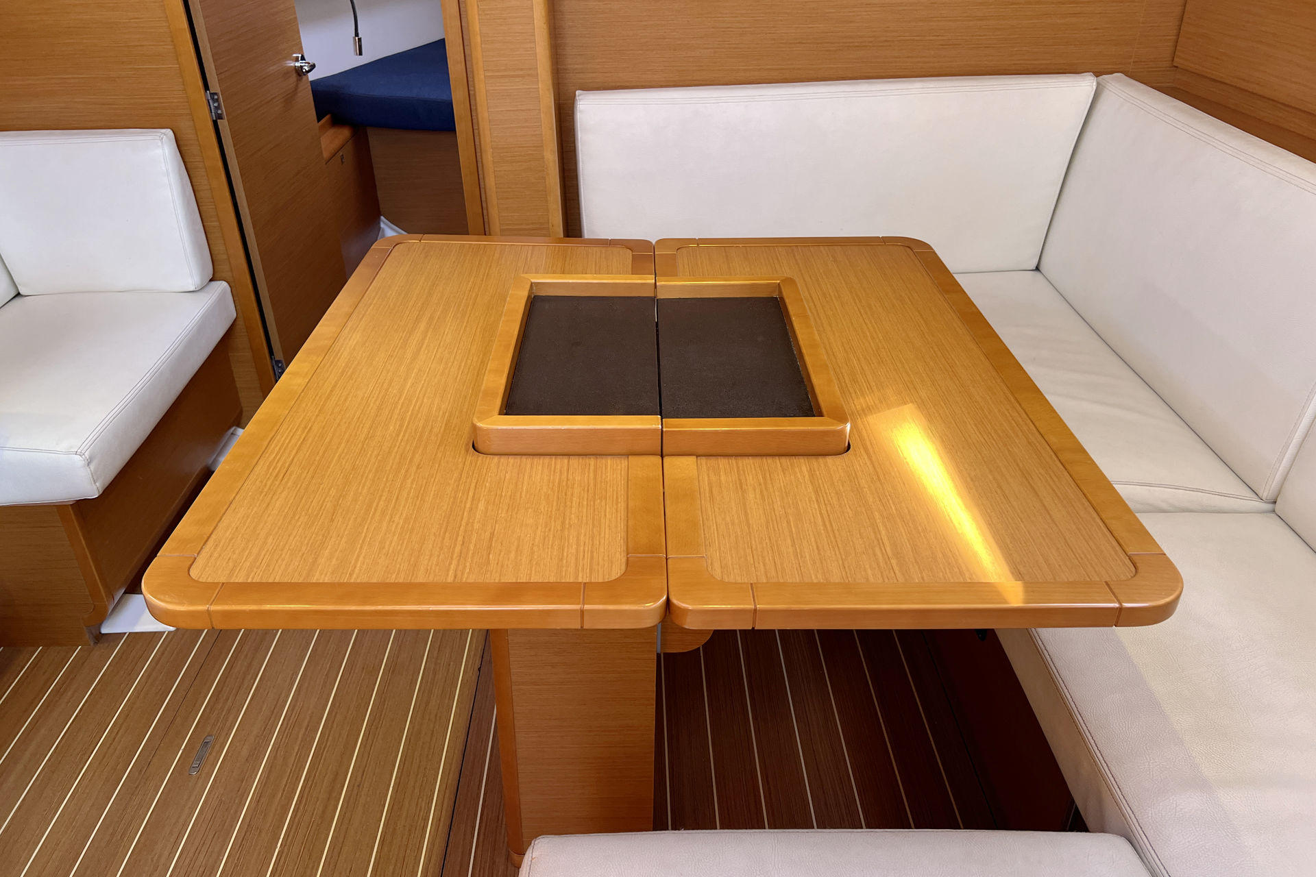 Komfort, Gemütlichkeit und Funktion sind die tragenden Themen beim zentralen Innenausbau. Die Einbauten in Salon und Pantry sind schlicht, die Linien ungebrochen und schnörkellos. Jeanneau veredelt seine Möbel weiterhin mit den fein gemaserten Fine-Teak-Furnieren von Alpi, jetzt allerdings in einem helleren Farbton. Besonders smart gelöst ist die Mechanik für den absenkbaren Salontisch. Ein Handgriff genügt, und das U-Sofa verwandelt sich in ein zusätzliches Doppelbett. Das hübsche Feature ist aber nur als Teil von zwei möglichen Ausbaustufen (Premiere und Preference) zu bekommen.